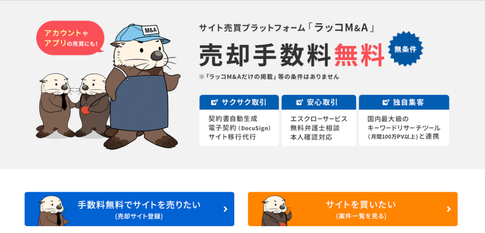ラッコM&Aとは、ラッコ株式会社が提供する国内最大級のサイト売買プラットフォームです。国内で唯一売却手数料が無料など、手軽にサイト売買ができることを強みに急成長しています。
