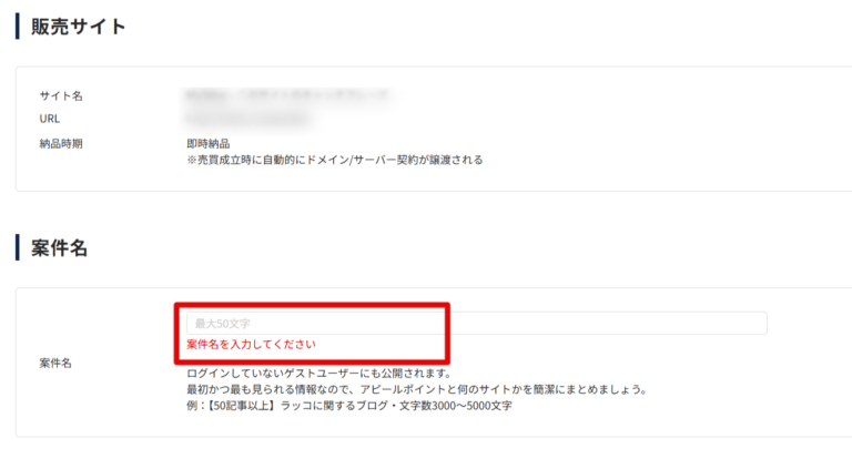 サイトの説明欄はないので、案件名にサイトのアピールポイントを簡潔に書きましょう。