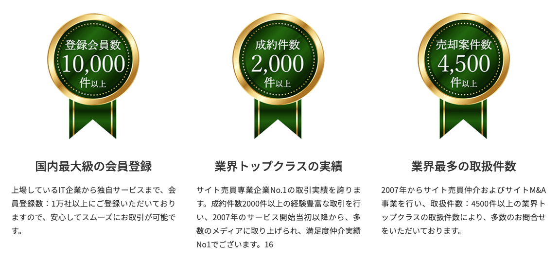 | 特徴 | ・掲載数・成約数No.1 ・売却手数料無料 | ・5秒で売買できる ・購入手数料無料 | ・成約率90%超 ・手厚いサポート | ・国内初の サイト売買サービス | ・累計成約数20億円 | ・非公開案件多数 | ・専任担当制 | ・10億円以上の 成約実績あり | ・世界最大の サイト売買サービス |