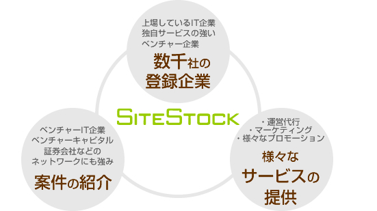 サイトストックは、IT系の上場企業からベンチャーのIT企業まで、数千社にわたるネットワークを保有しています。
